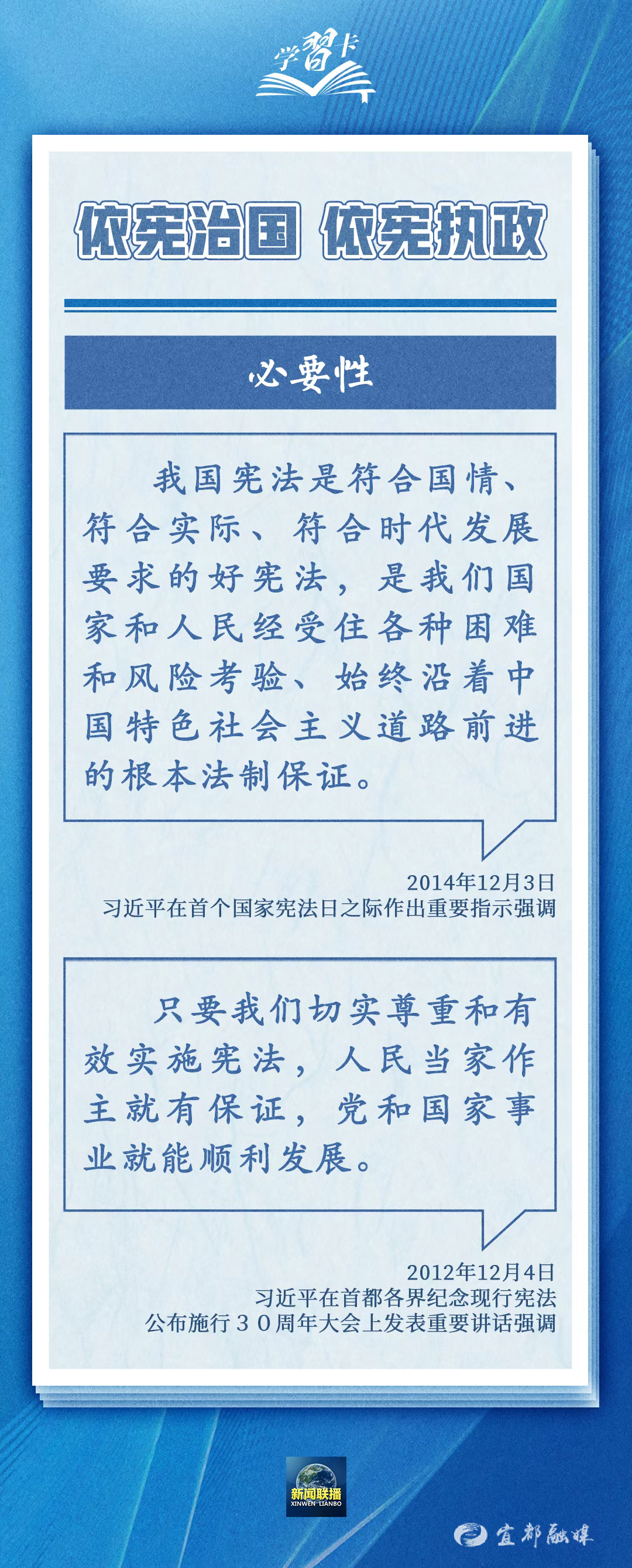 围绕依宪治国、依宪执政,习近平总书记多次在不同场合强调,宪法是党和人民意志的集中体现,丰富和发展了中国特色社会主义法治理论,也为推进国家治理体系和治理能力现代化指明了根本路径和努力方向。一起学习——